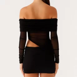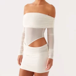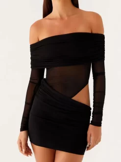 Women Mesh Off Shoulder Mini Dress Solid Color Ruched Cut Out Long Sleeve Backless Bodycon Dress for Party Club